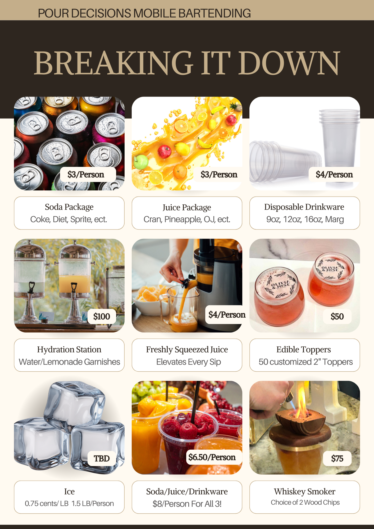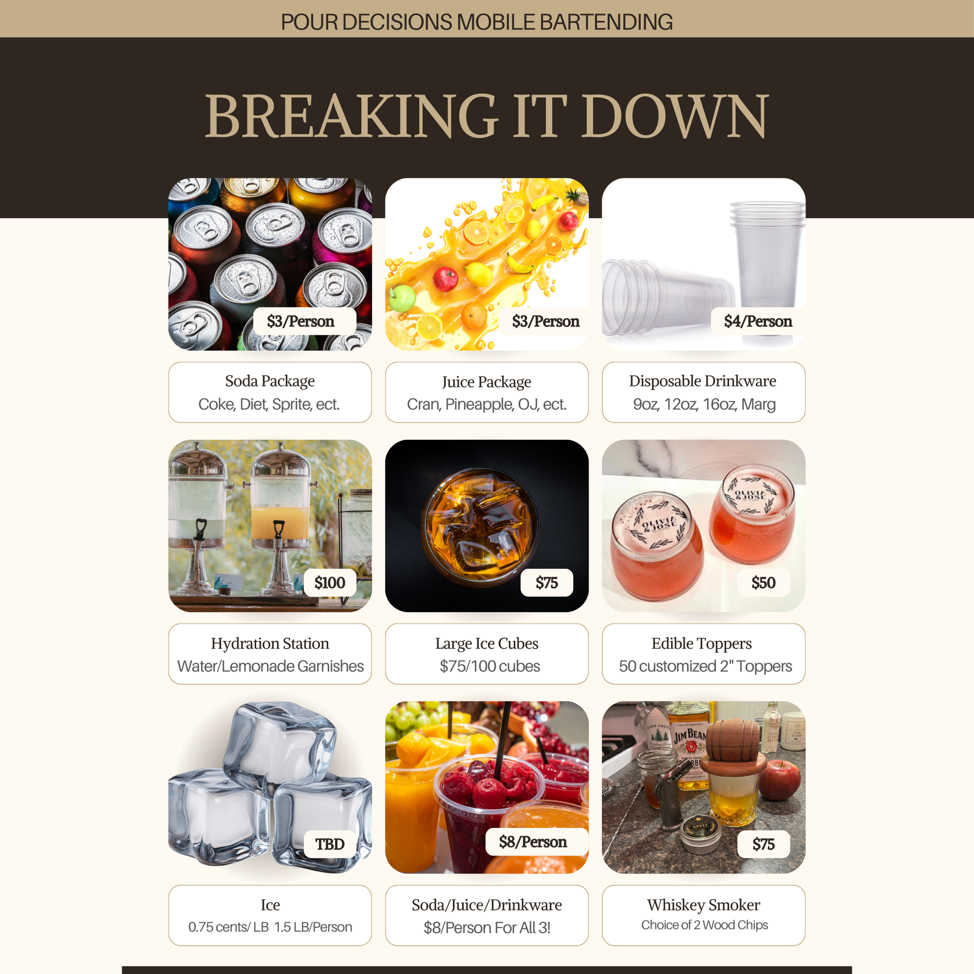 DON'T be told what you need, make YOUR "decision" and pick a service package that suits your event's needs best from our “Decisions List”! You can also check out our “Pour Me an Extra” options for add-ons, our NEW Hydration Bar, and freshly squeezed juice option.